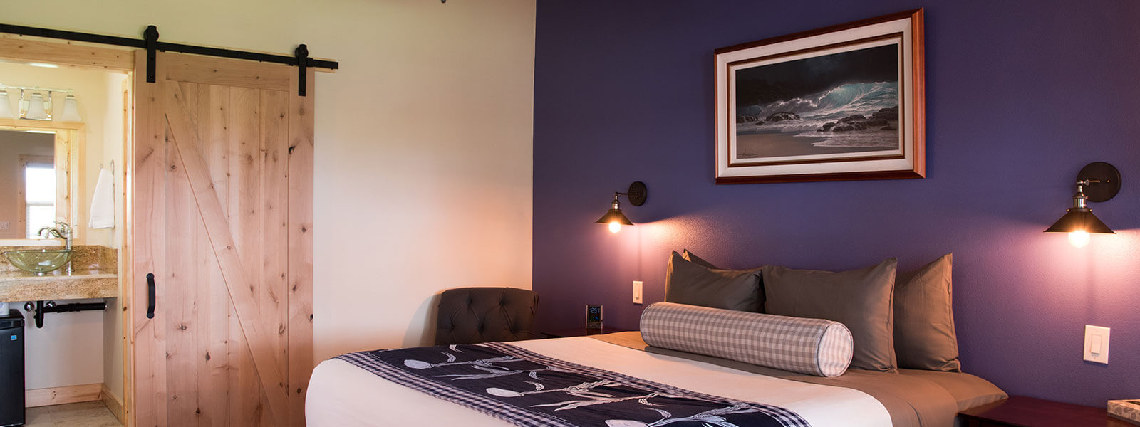 Features a king bed with a 40″ LCD smart television, round dining table with seating for two, single lounge chair for relaxing. Push aside our signature barn door to expose our modern bathroom with ample lighting and counter space. Enjoy the gas heated rain-head and handheld shower with bench while lathering with eco-friendly Hawaiian Body Products bath amenities made locally on the Big Island. Room Size: approximately 280 sq. ft.
