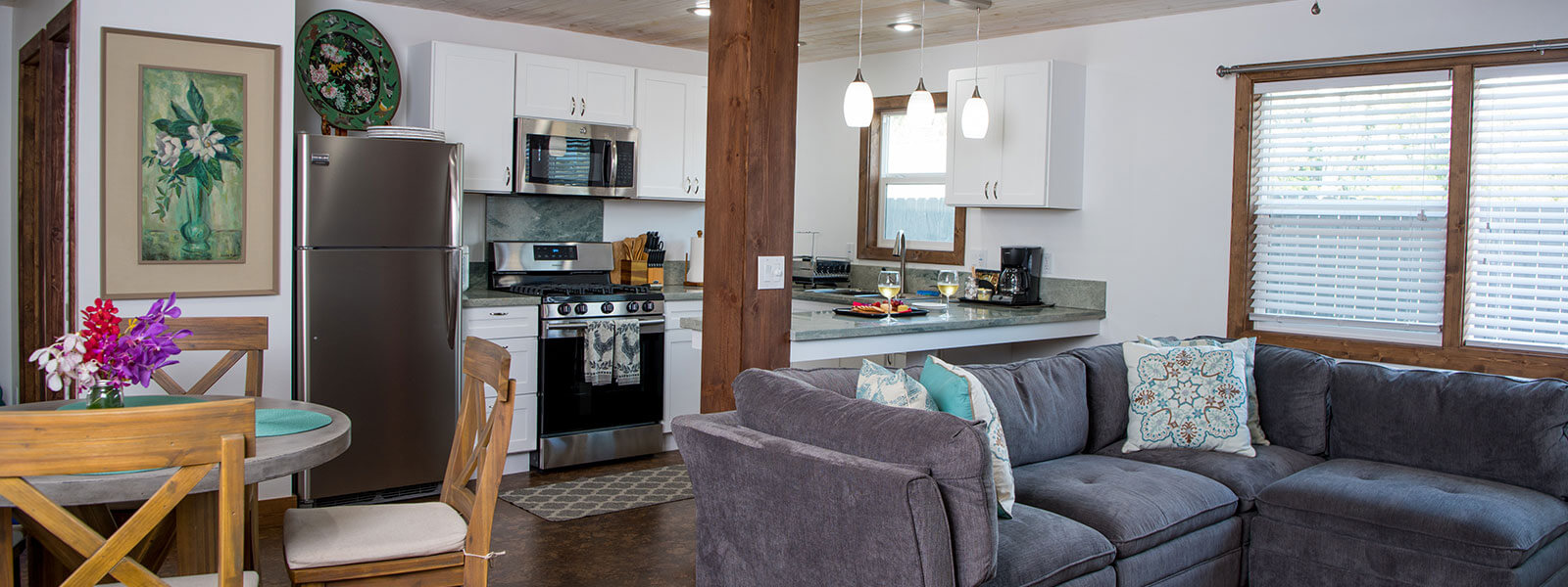 A second-floor unit, just under 1000 square feet. This spacious one-bedroom, one bath suite easily accommodates up up to 6 persons comfortably. The barn door enclosed bedroom has a one king bed with a pair of bunk beds located in the open living area. The bunkbeds feature full sized pillow-top mattresses on the bottom and twin memory foam mattresses on top. The living area includes a 48″ Samsung Smart television; full kitchen with a marble bar height counter and 4 barstools; large dining table for six; private bathroom with rain-head shower and double vanity sinks. Engulf your senses with our organic and locally made Hawaiian Body Products in both coconut and passion fruit scents.